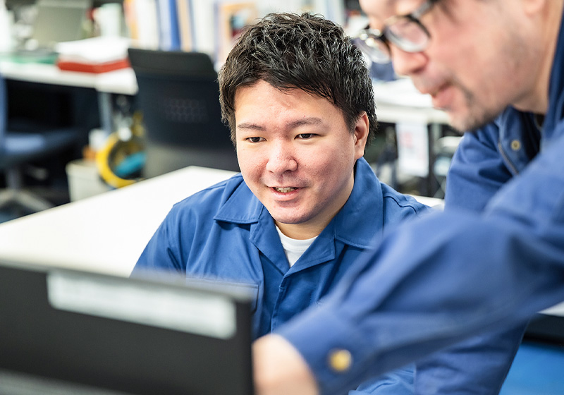 現在は特に熱交換部品の製造に注力しており、製品の性能に直結する熱伝導率の向上を目指して材料選定や形状設計に工夫を凝らしています。お客様の理想を形にするため、最適な成型条件を追求しながら日々試行錯誤を重ねています。また、使用しているプリンタは海外製のため、現地技術者との英語でのやり取りも重要な業務の一つです。実際に海外拠点を訪問し、開発現場の見学や技術者との交流を行うことで、最新技術への理解を深め、製品開発に活かしています。
